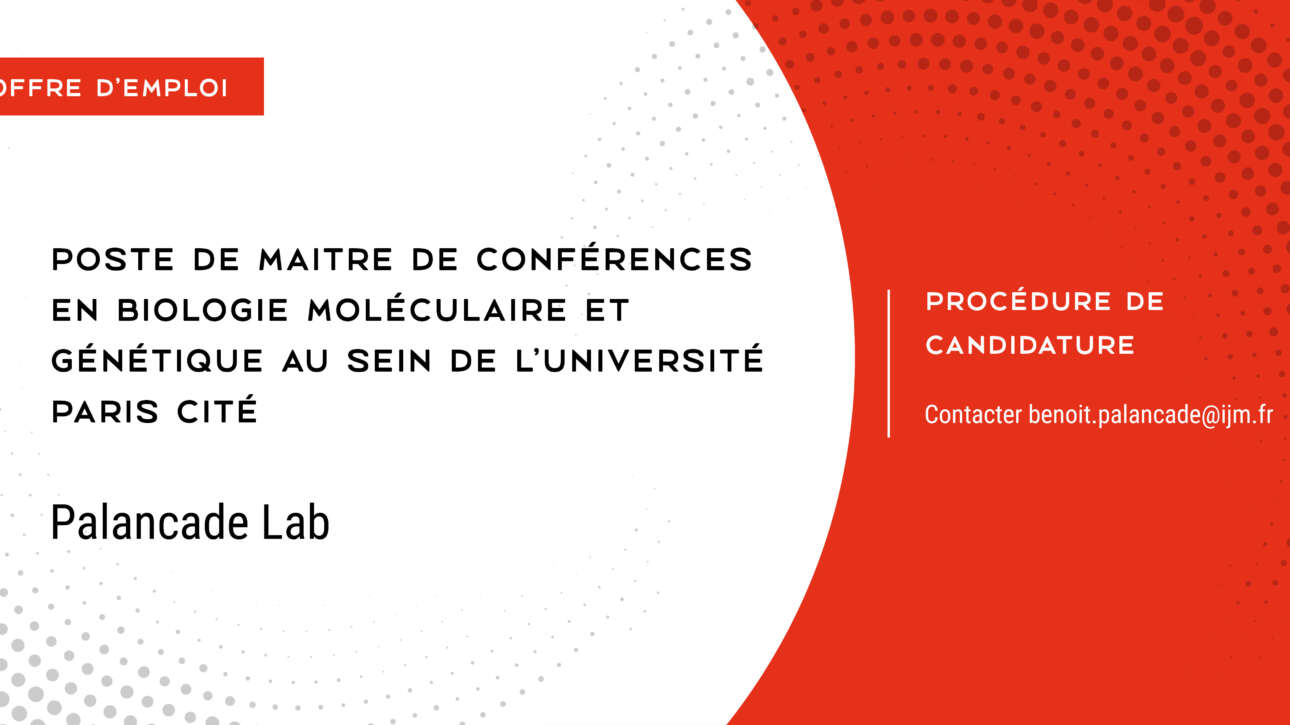 Un poste susceptible d’être vacant de Maitre de Conférences en Biologie Moléculaire et Génétique devrait s’ouvrir pour la rentrée 2026 à l’UFR Sciences du Vivant de l’Université Paris Cité. L’équipe Palancade, au sein de l’Institut Jacques Monod, est l’une des trois équipes d’accueil potentielles.