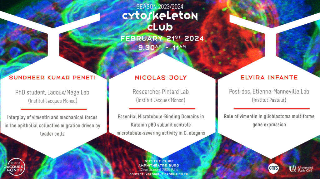 La prochaine réunion du Cytoskeleton club aura lieu mercredi 21 février à 9h30 à l’Institut Curie (Amphithéâtre Burg)
