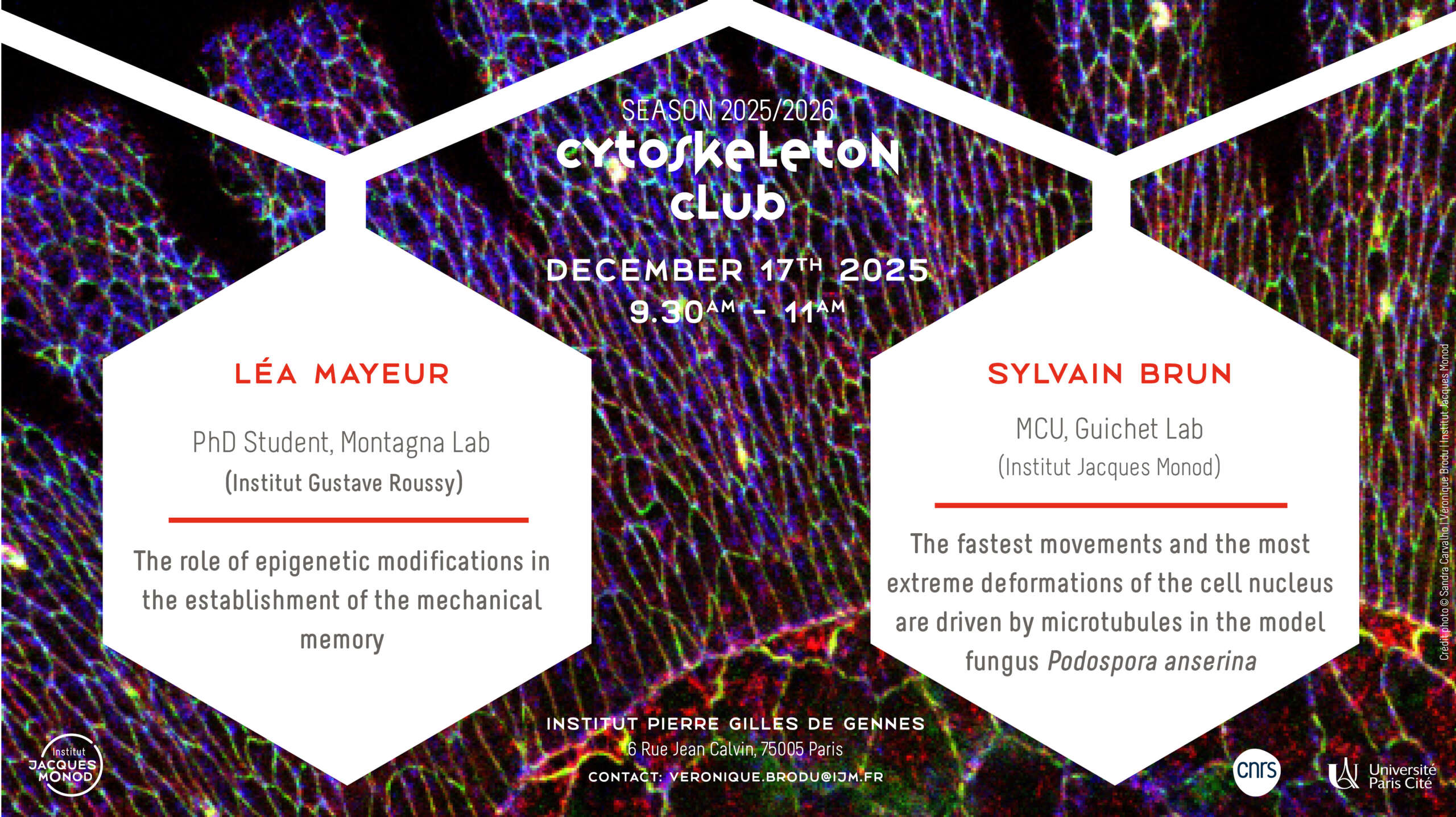 - Léa Mayeur, PhD student , Guillaume Montagna’s team, Institut Gustave Roussy présentera « The role of epigenetic modifications in the establishment of the mechanical memory »