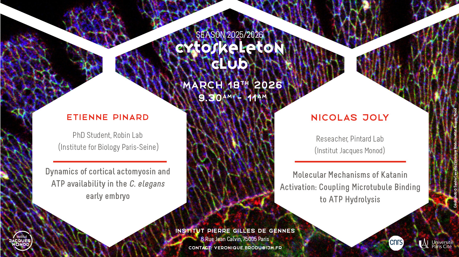 - Nicolas Joly, (Pintard team, Institut Jacques Monod) présentera « Molecular Mechanisms of Katanin Activation: Coupling Microtubule Binding to ATP Hydrolysis »