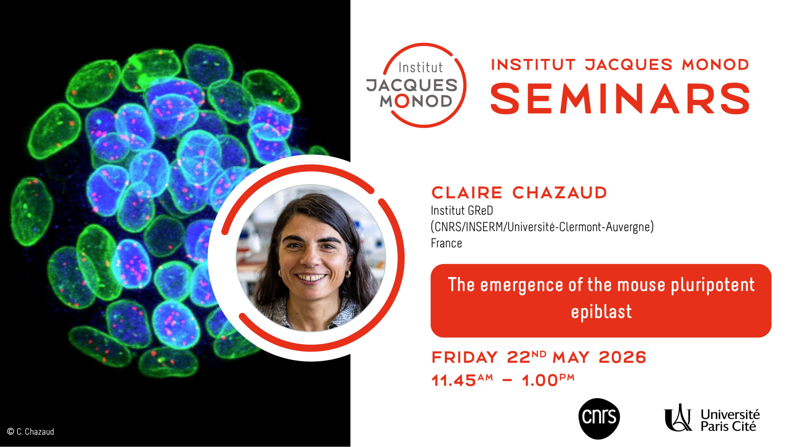 Invited by the Ribes / Nedelec lab, Claire Chazaud (DR INSERM, Institut GReD (CNRS/INSERM/Université-Clermont-Auvergne) will present an Institut Jacques Monod seminar on the theme: The emergence of the mouse pluripotent…