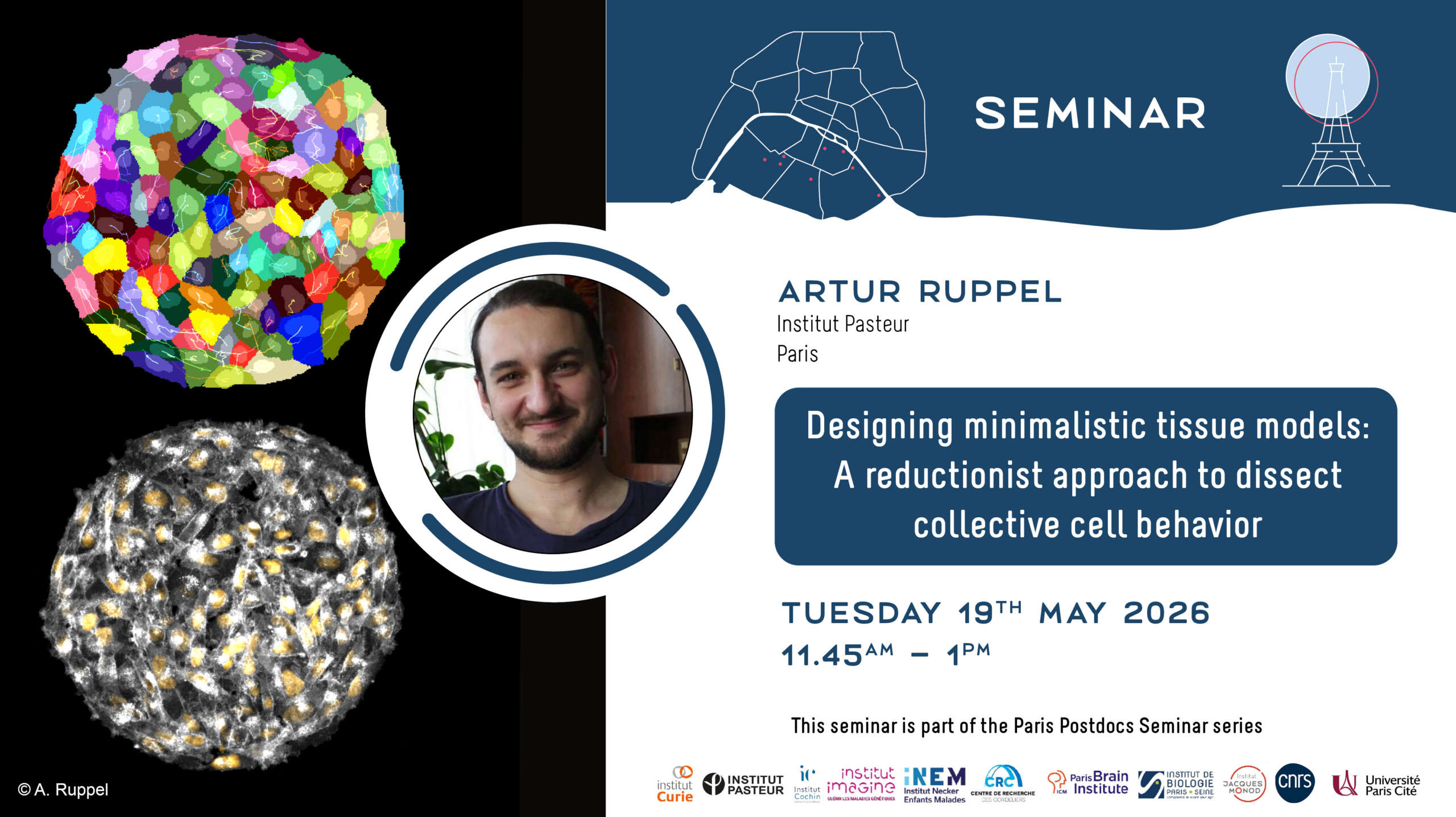 Invité par l'Institut Jacques Monod, Artur Ruppel ( Institut Pasteur) présentera un Paris Postdoc seminar sur le thème : Designing minimalistic tissue models: A reductionist approach to dissect collective cell…