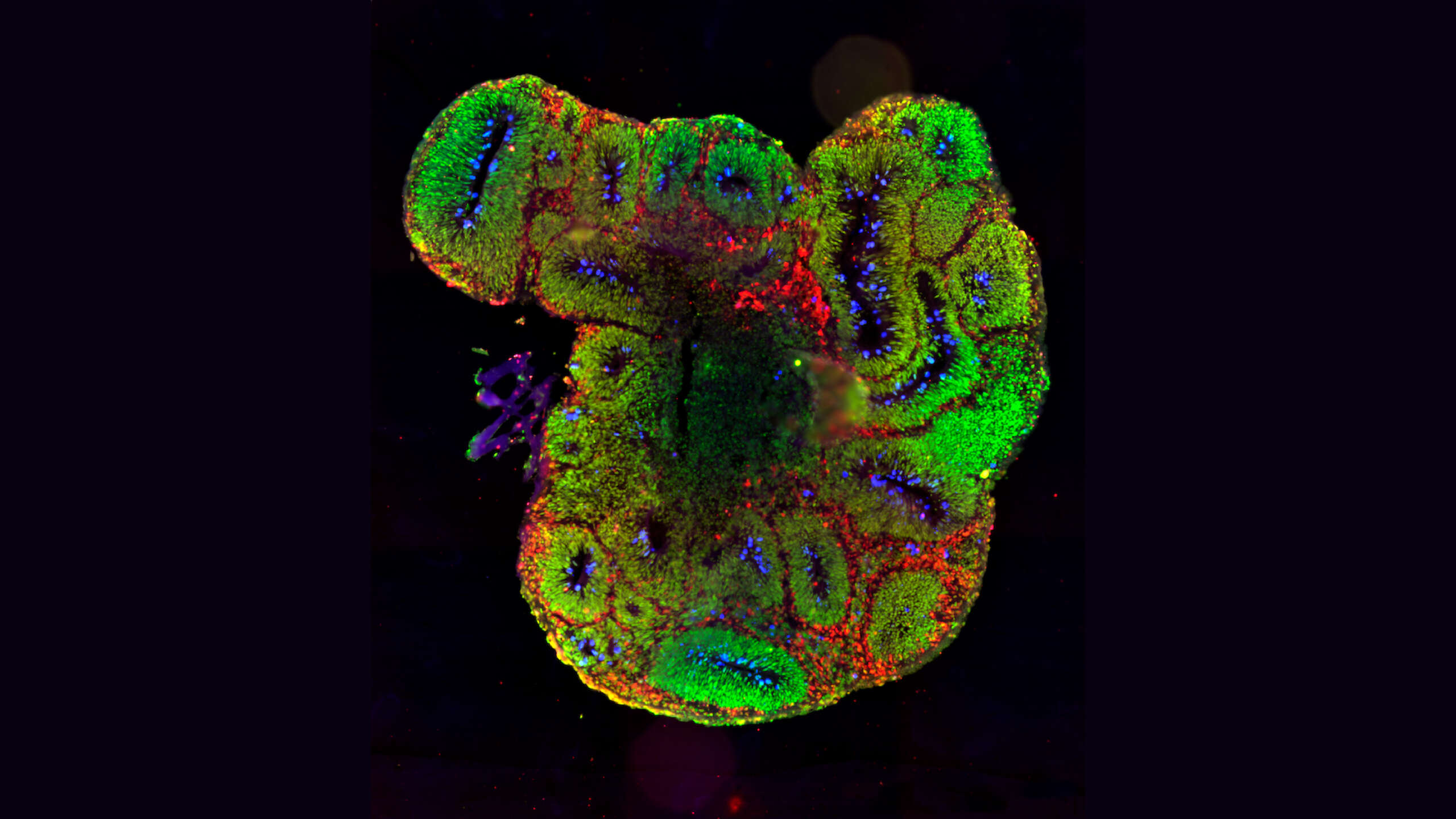 Section d’un organoïde cérébral à jour 20 marqué avec Sox1 (vert), HuC/D (rouge) et PhosphoHistone H3 (bleu) © Kamal Bouhali / enSCORE / Institut Jacques Monod