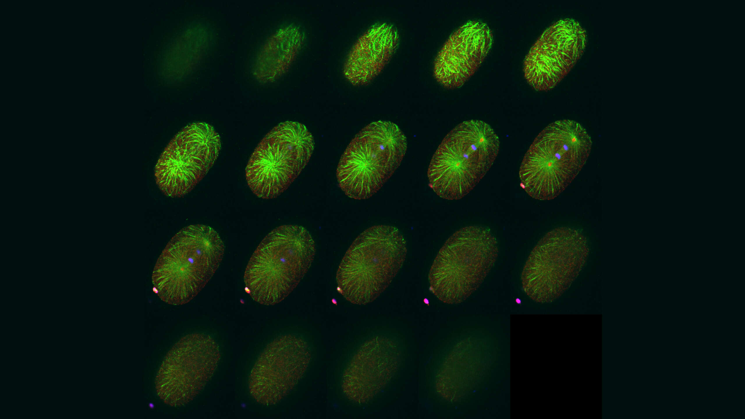 Première division mitotique d’un embryon du némathode Caenorhabditis elegans (microtubules en vert, chromosomes en bleu et Katanine en magenta). © Nicolas Joly / Lionel Pintard /Institut Jacques Monod