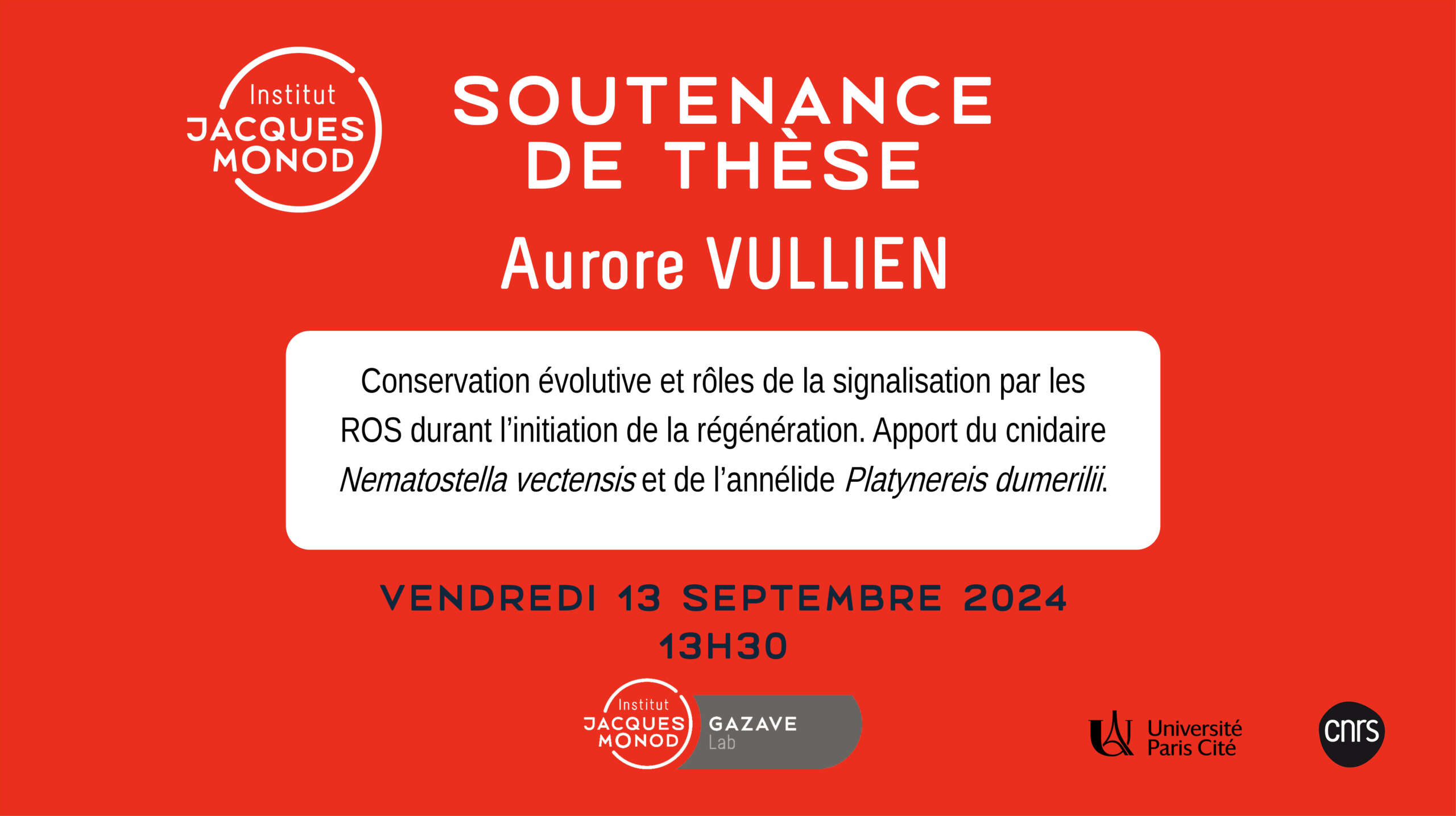 - Aurore Vullien. Rôle des dérivés réactifs de l’oxygène (DRO) dans la régénération de structures complexes chez les annélides et les cnidaires. Directeurs de thèse : Eve Gazave et Eric Röttinger. Thèse en cotutelle entre Université Paris Cité (Ecole doctorale BioSPC) et Université de Nice (Ecole Doctorale des Sciences de la Vie et de la Santé). Thèse soutenue le 13 Septembre 2024