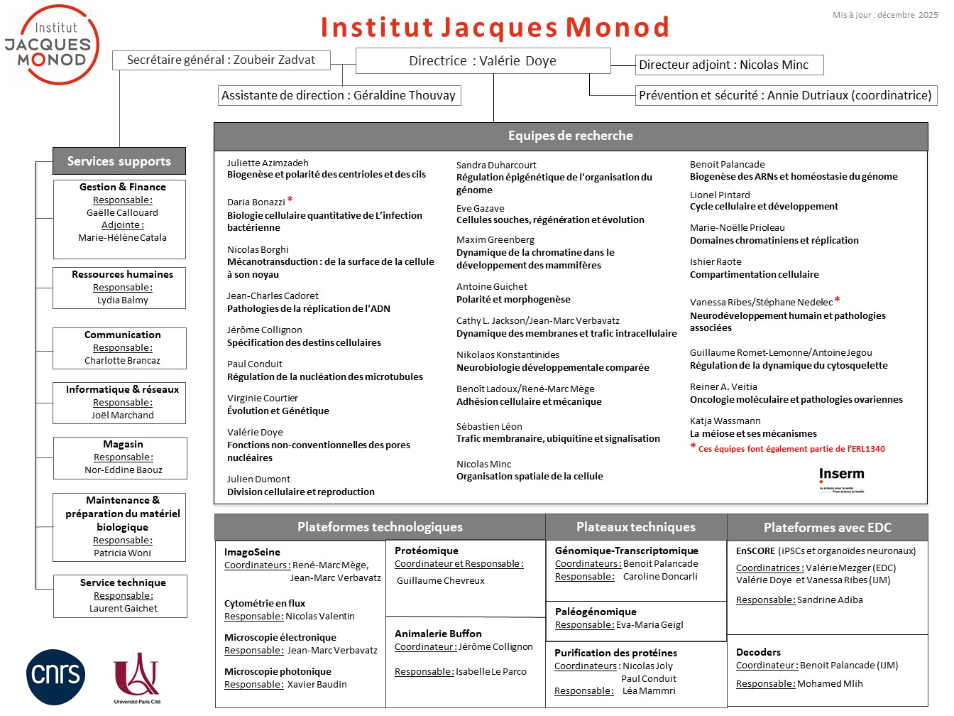 Valérie DOYE. Après avoir soutenu sa thèse de doctorat en 1991 à l’Université Pierre et Marie Curie sur la différenciation cellulaire des neurones, Valérie Doye effectue un post-doctorat jusqu’en 1994 au Laboratoire européen de biologie moléculaire (Heidelberg, Allemagne). Elle s’y spécialise sur les composants des pores nucléaires, les nucléoporines, et leur rôle dans le transport entre le cytoplasme et le noyau. En 1994, elle entre au CNRS puis développe à l’Institut Curie son équipe de recherche dans laquelle elle caractérise le rôle des nucléoporines dans l’assemblage des pores nucléaires, mais aussi certaines de leurs fonctions non-conventionnelles dans la division cellulaire et l’intégrité des génomes. En 2008, elle installe son équipe à l’Institut Jacques Monod. Elle reçoit en 2009 la médaille d’argent CNRS pour ses travaux de recherche. Responsable du programme de biologie cellulaire puis membre du comité de direction de l’Institut Jacques Monod, elle en devient directrice adjointe en 2020 puis directrice en 2023.