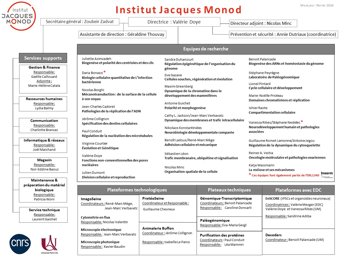 Valérie DOYE. Après avoir soutenu sa thèse de doctorat en 1991 à l’Université Pierre et Marie Curie sur la différenciation cellulaire des neurones, Valérie Doye effectue un post-doctorat jusqu’en 1994 au Laboratoire européen de biologie moléculaire (Heidelberg, Allemagne). Elle s’y spécialise sur les composants des pores nucléaires, les nucléoporines, et leur rôle dans le transport entre le cytoplasme et le noyau. En 1994, elle entre au CNRS puis développe à l’Institut Curie son équipe de recherche dans laquelle elle caractérise le rôle des nucléoporines dans l’assemblage des pores nucléaires, mais aussi certaines de leurs fonctions non-conventionnelles dans la division cellulaire et l’intégrité des génomes. En 2008, elle installe son équipe à l’Institut Jacques Monod. Elle reçoit en 2009 la médaille d’argent CNRS pour ses travaux de recherche. Responsable du programme de biologie cellulaire puis membre du comité de direction de l’Institut Jacques Monod, elle en devient directrice adjointe en 2020 puis directrice en 2023.