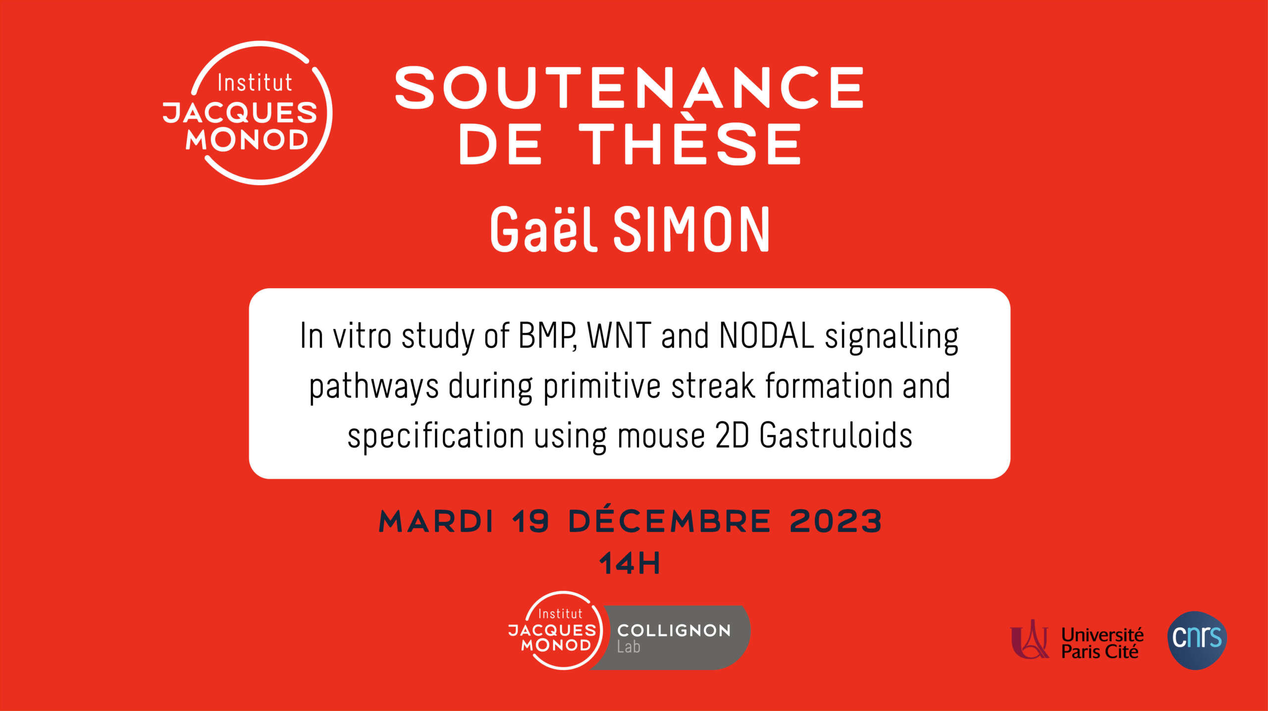 - Gaël Simon (2023) – Université Paris Cité: In vitro study of BMP, WNT and NODAL signalling pathways during primitive streak formation and specification using mouse 2D Gastruloids