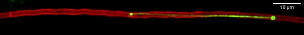 GFP-tagged male nucleus moving from right to left and stretching while passing by septal pore; nuclear membranes are tagged with the mCherry