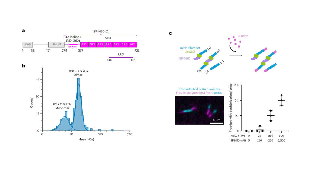 Figure credit : Liu T, Cao L, Mladenov M, Romet-Lemonne G, Way M, Moores CA. Arp2/3-mediated bidirectional actin assembly by SPIN90 dimers. Nat Struct Mol Biol. 2025 Sep 15. doi: 10.1038/s41594-025-01665-8. Epub ahead of print. PMID: 40954369.