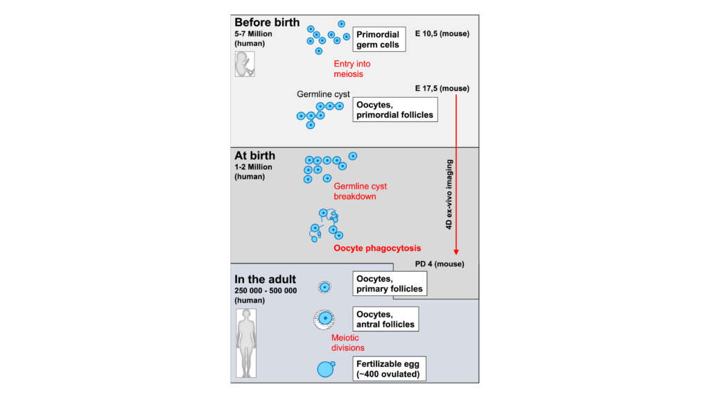 Oocyte development is a fierce competitive process in which only a small fraction of germ cells survives massive waves of cell death to become a fertilizable egg. Using an ex vivo 4D imaging system, Zhang and colleagues discovered that individual oocytes actively move, extend filopodia-like protrusions, and engulf the debris of their dying neighbors to fuel their own growth (Zhang et al, 2025a). These findings reveal a previously unrecognized, phagocytosis-driven mechanism of oocyte selection that shapes the ovarian reserve.